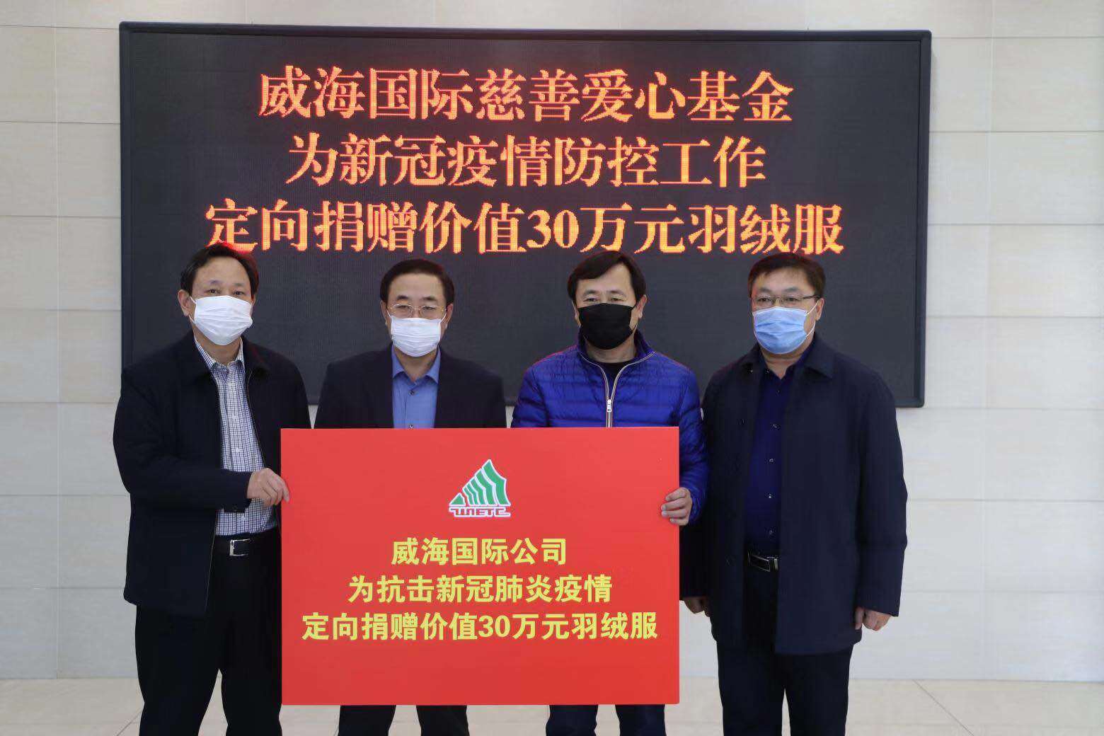 2月5日下午,威海國(guó)際公司慈善愛(ài)心基金為新冠肺炎疫情防控工作定向捐贈(zèng)價(jià)值30萬(wàn)元的羽絨服,助力威海市新冠肺炎疫情防控工作的開(kāi)展。